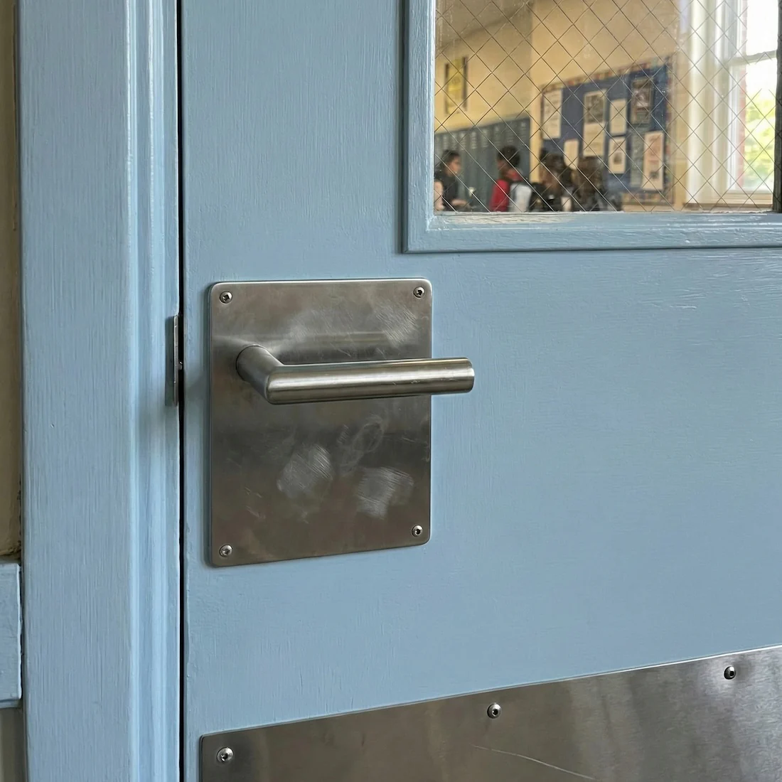 Juego de manillas (2 manillas; 1 manilla para cada lado de la puerta) con placa cuadrada de 170 de acero inoxidable en acabado inox para puertas de interior y de paso. Este juego de manillas con placa es ideal para puertas de colegio, para hospitales y para puertas de lugares públicos.