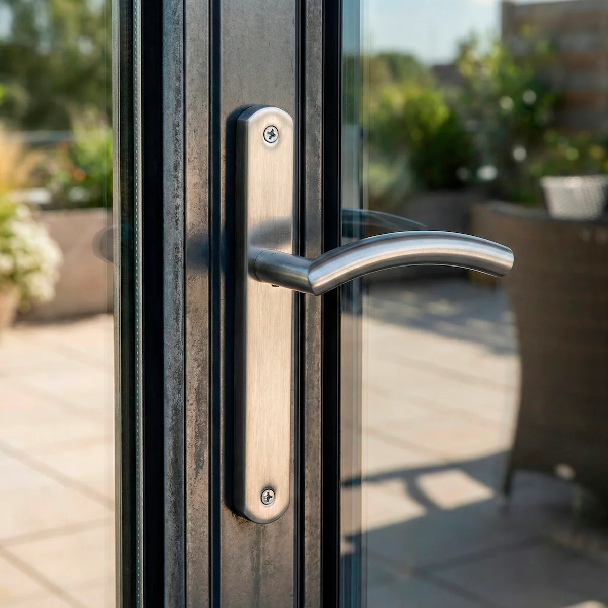 Juego de manillas (2 manillas; 1 manilla para cada lado de la puerta) con placa ovalada estrecha de acero inoxidable para puertas de exterior o puertas metálicas modelo 703. Esta manilla de placa estrecha con diseño sencillo es fácil de instalar y fácil de conjuntar con cualquier puerta. Viene con todos los accesorios necesarios para su instalación.