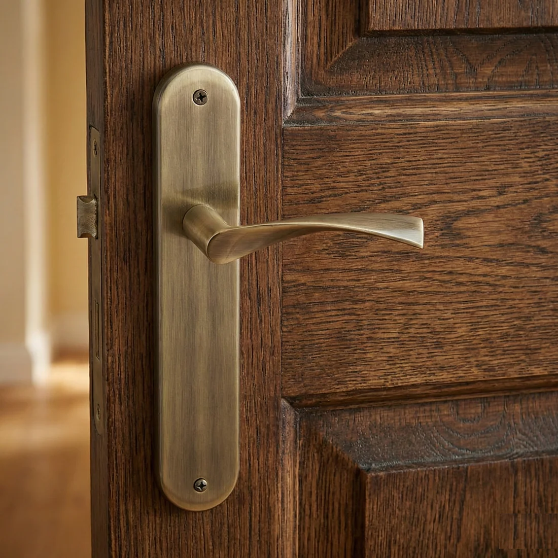 Juego de manillas (2 manillas; 1 manilla para cada lado de la puerta) con placa ovalada modelo ola de zamak en acabado cuero para puertas. Esta manilla es elegante, clásica y ideal para las puertas de tu casa. Además, viene con todos los accesorios necesarios para su instalación por lo que ¿A qué esperas para renovar las manillas de tus puertas?