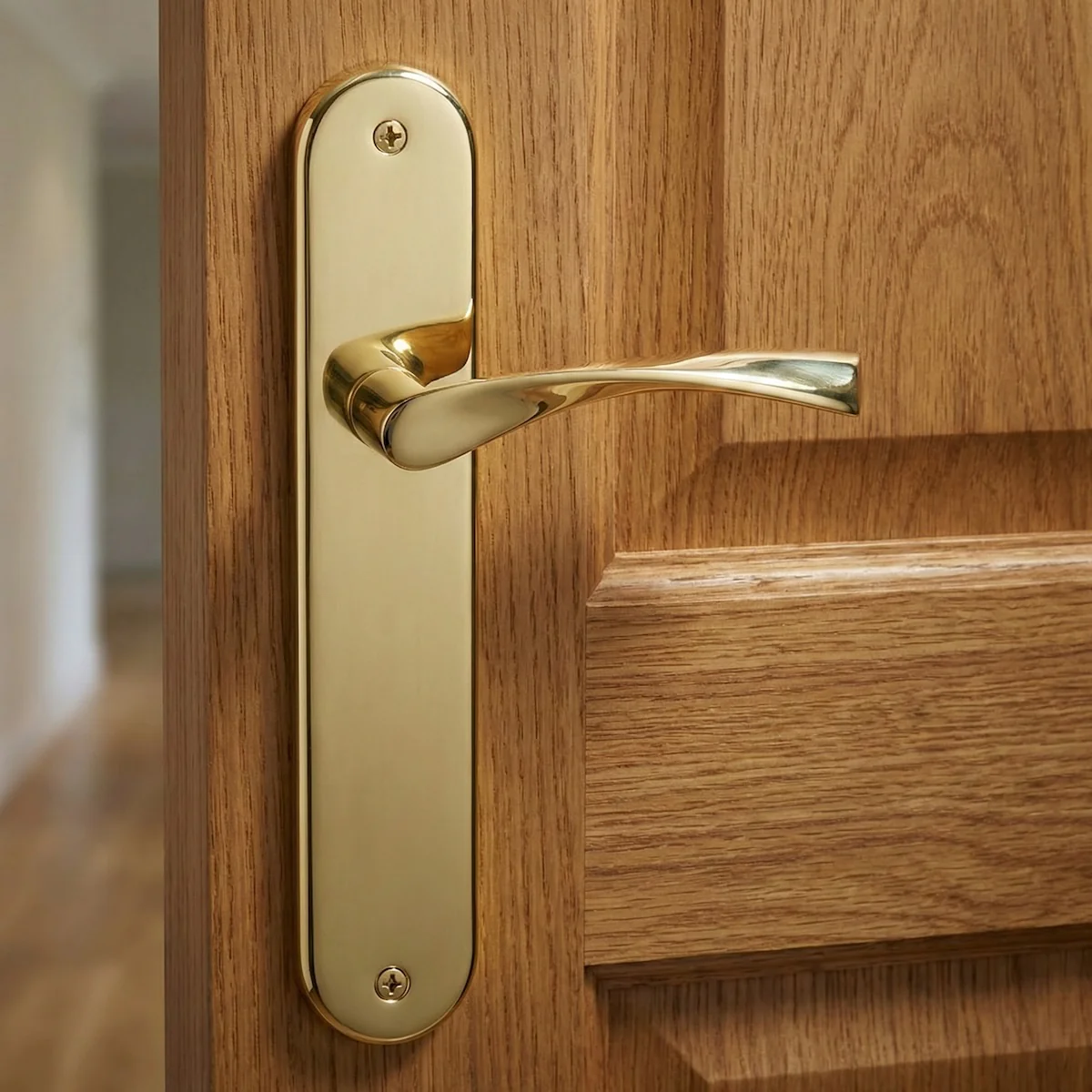 Juego de manillas (1 manilla para cada lado de la puerta) ola con placa ovalada para puertas de interior modelo 130 en acabado dorado brillo. Esta clásica manilla de dos tornillos, uno en la parte superior y otro en la inferior, sigue una linea elegante y moderna para instalar en las puertas de tu hogar. Renueva las manillas de tus puertas al mejor precio. Además, incluye todos los accesorios necesarios para su instalación.