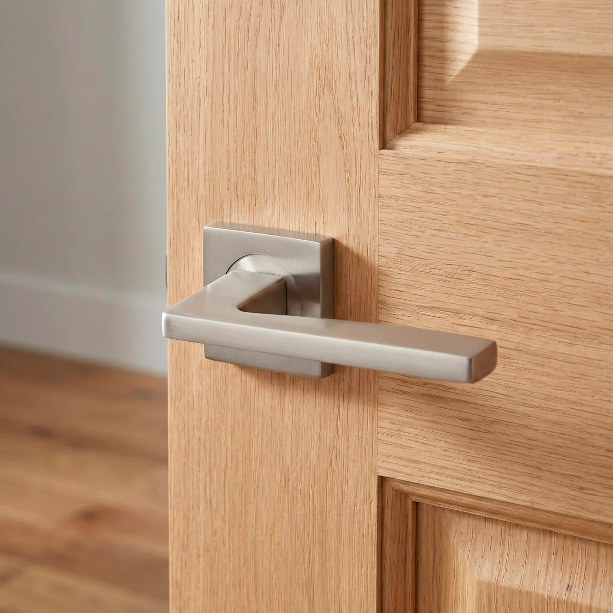 Juego de manillas (2 manillas para una puerta) con roseta cuadrada de aluminio en acabado níquel mate para puertas de interior y de exterior. Esta manilla con roseta cuadrada, tiene mucha presencia y destaca especialmente frente a otras debido a su elegante y especial acabado en níquel mate preparado para sorprender y hacer elegante cualquier puerta. Su diseño sencillo pero vanguardista permite combinar la roseta en cualquier otra puerta y su presencia no deja indiferente a nadie. Además, esta roseta viene con todos los accesorios de instalación incluidos.
