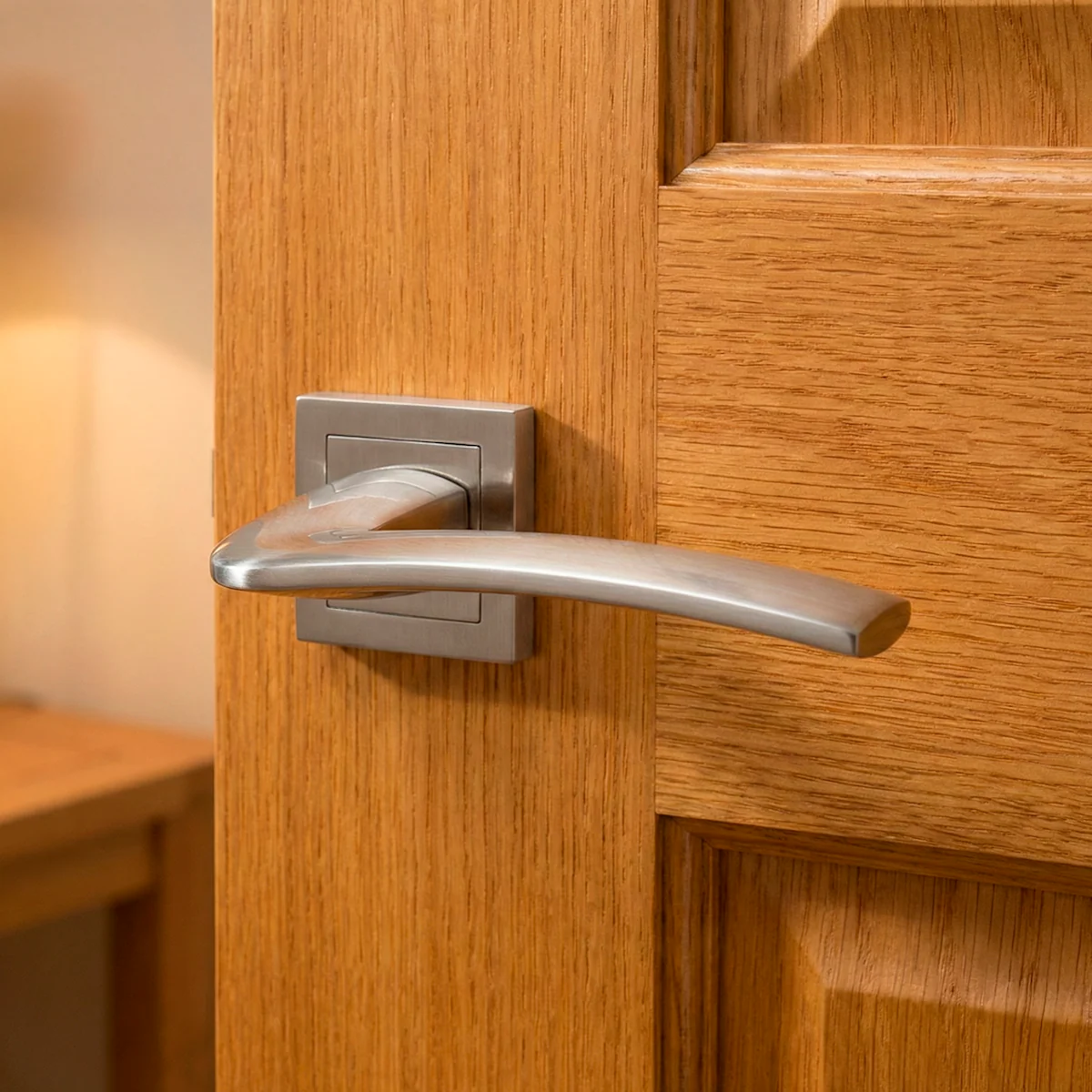 Manilla modelo '340' de zamak con roseta cuadrada en acabado níquel satinado para puertas