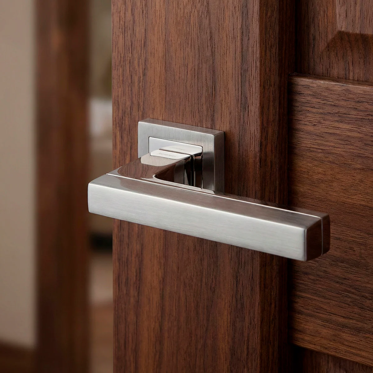 Juego de manillas (incluye 2 manillas para una puerta) de zamak modelo 840 con roseta cuadrada en acabado bicolor cromo brillo y gris espacial para puertas de interior y de paso. Esta manilla es una de nuestras novedades más recientes. Es una roseta de alta gama de gran calidad elegante y vanguardista preparada para aportar un toque de elegancia y distinción a las puertas de tu casa. Gracias a su acabado, tus puertas ganaran en luminosidad y la sensación de amplitud será mayor. Pasarás a ser la envidia de todos. Además, viene con todos los accesorios de instalación incluidos por lo que ¿A qué esperas para cambiar las manillas de tus puertas?