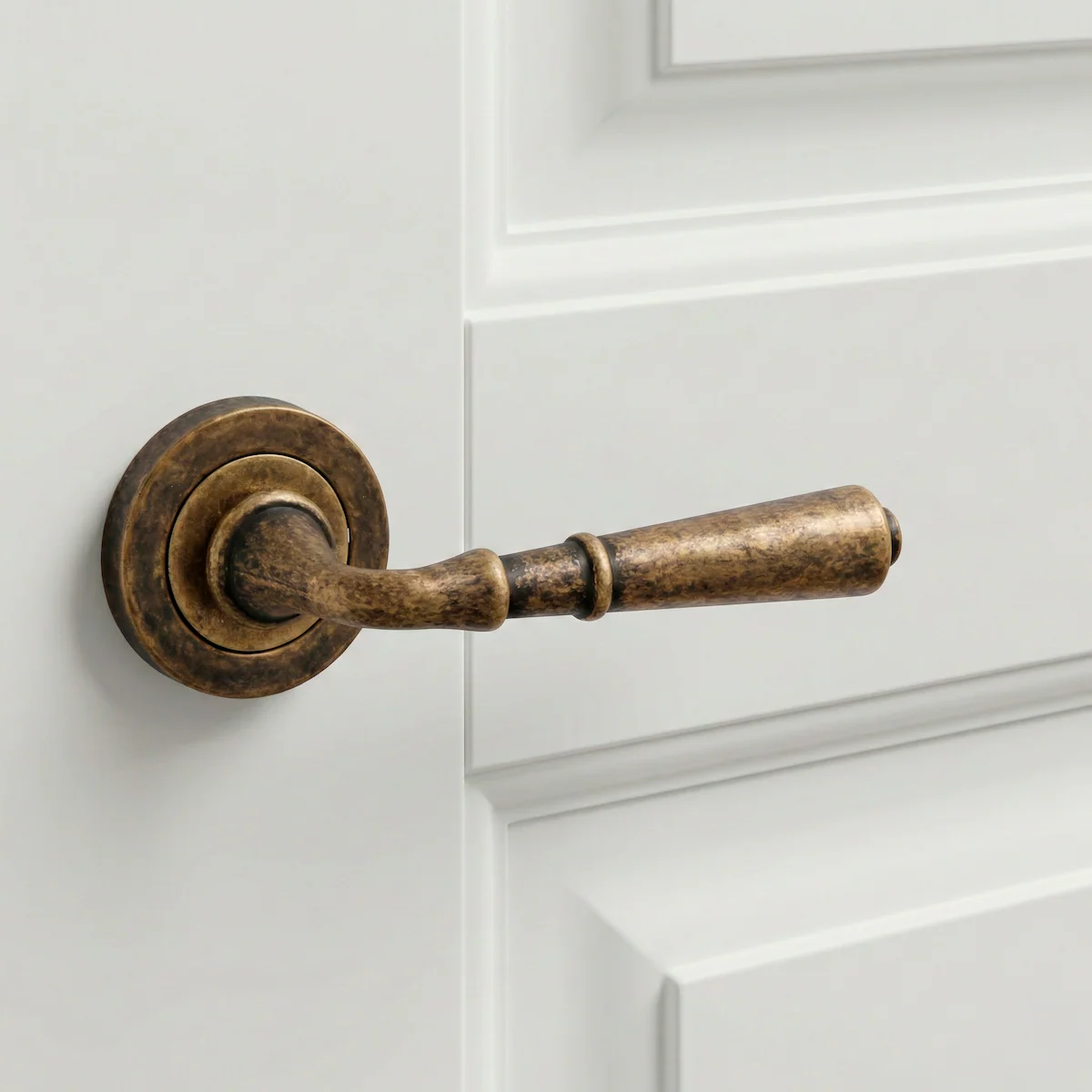 Manilla modelo '507' con Roseta Redonda en acabado cuero envejecido para puertas