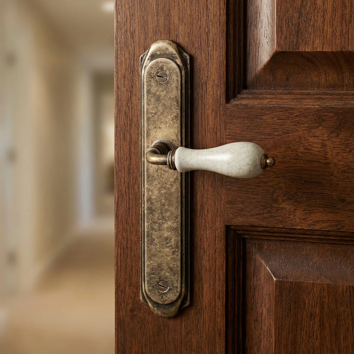 Manilla modelo '4007' rústica con placa curva acabado cuero envejecido y porcelana para puertas